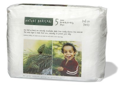 Nature Babycare diapers and training pants are 100% chlorine-free and keep oil-based plastics away from baby's sensitive skin. The absorbent pulp is from sustainably harvested Scandinavian forests and the unique center-channel means a less bulky fit while enhancing leak protection. Since they use 60% natural materials instead of plastic, Nature Babycare diapers are soft and cloth-like providing comfort without sacrificing protection. With Nature Babycare, you never have to sacrifice performance to go green! Features and Benefits of Nature Babycare Pull On Pants: No oil-based plastics against baby's skin Stretchy tear-away sides for comfort and convenience Soft, cloth-like feel provides a non-bulky fit, enabling your child to move around freely! Kinder and more gentle to your baby and the environment Breathable and chlorine-free with natural based material, for natural protection Size 4: 18lbs+ (22ct pack) Size 5: 26lbs+ (20ct pack) Size 6: 35lbs+ (18ct pack)